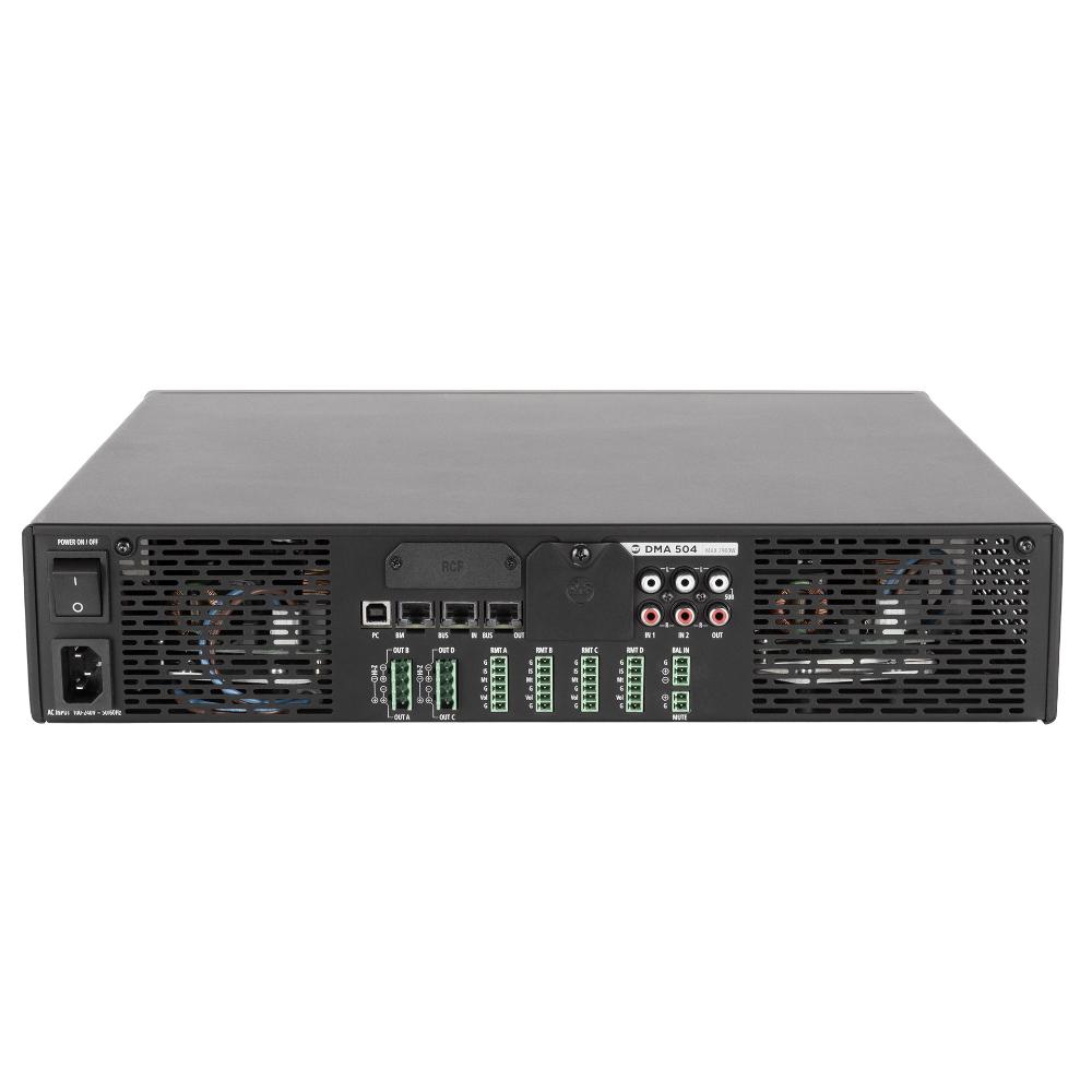 DMA 504 to czterokanałowy wzmacniacz matrycowy klasy D zapewniający 4 wyjścia mocy 500 W każde. Wyposażony w wydajną platformę DSP, wejścia i wyjścia mogą być zarządzane pod kątem routingu i korekcji. Pełny zestaw funkcji przetwarzania obejmuje PEQ, filtry FIR, wzmocnienie basów, ograniczniki, kompresory i korekcję środowiskową. Ustawienia wstępne dla głośników RCF są dostępne na każdym kanale w celu uzyskania optymalnej wydajności akustycznej i niezawodności. Może dystrybuować 4 kanały audio do innych jednostek za pośrednictwem analogowej magistrali audio, łącząc elastyczną i skalowalną architekturę multiroom z łatwym podłączeniem i instalacją. Konfiguracja jest prosta i przyjazna dla użytkownika i może być przeprowadzona za pomocą elementów sterujących na panelu przednim (z wyświetlaczem OLED) lub RDNet. Dzięki elastyczności instalacji, dokładnej konstrukcji i solidności DMA 504 jest idealny do szerokiej gamy zastosowań biznesowych i dźwiękowych.